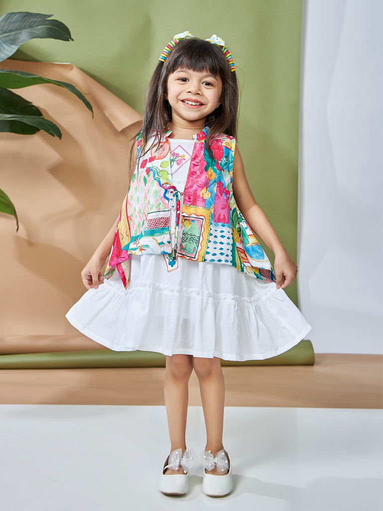 This sleeveless A-line dress is made from soft cotton with a cotton lining and has a stand collar and zip fastening for a clean finish. The cute prints and geometric lines add to the festive theme of Onam, perfectly complementing the celebratory occasion.
