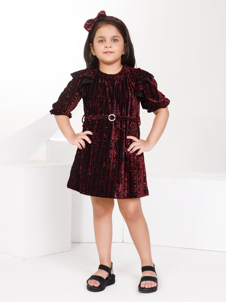 Girls Velvet Dress Belt & Hairband 17363A charming A-line, knee-length velvet dress with a flared fit, round neck, and full straight sleeves—perfect for a 6 month baby girl dress for a wedding. Featuring a stylish belt, zip closure, and soft polyester lining, it’s an amazing autumn essential!