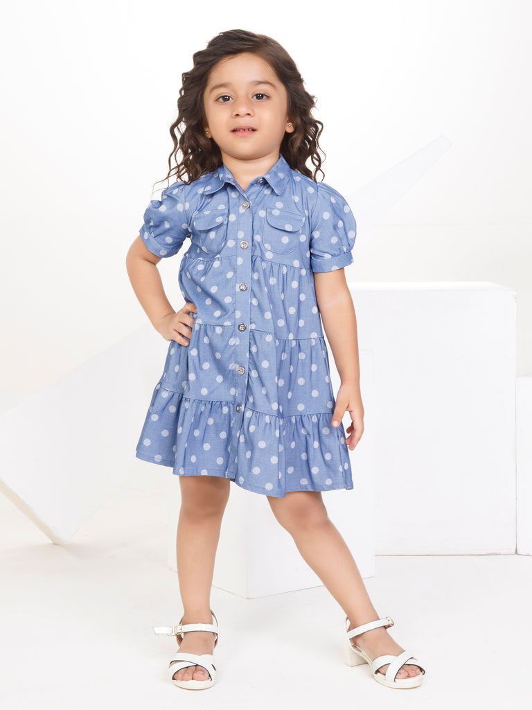 Girls Denim Dress 16842Stay effortlessly chic with this Fashion Rainbows inspired comfort-fit baby girl dress design for wedding. Crafted from plain woven cotton, it features a stylish shirt collar, short balloon sleeves, a straight fit, and button closure—perfect for special occasions!
