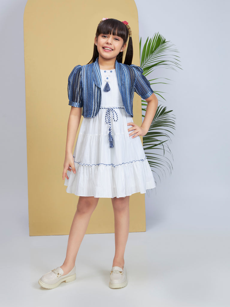 Add charm to her wardrobe with this elegant jacket dress in soft hues of blue and white.